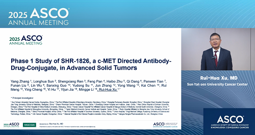 2025年美国临床肿瘤学会(ASCO)年会于5月30日至6月3日在美国芝加哥举行。本次大会,由中山大学肿瘤防治中心徐瑞华教授牵头、G22恒峰自主研发的靶向细胞间质上皮转换因子(c-MET)ADC药物SHR-1826的一项I期临床研究入选临床科学研讨会,并由徐瑞华教授口头报告了该研究结果。该研究由43家国内中心共同完成。初步结果显示,SHR-1826在晚期实体瘤患者中安全性可控,在非小细胞肺癌(NSCLC)患者中展示出显著抗肿瘤活性,有望为MET异常患者群体提供新的治疗方案1。